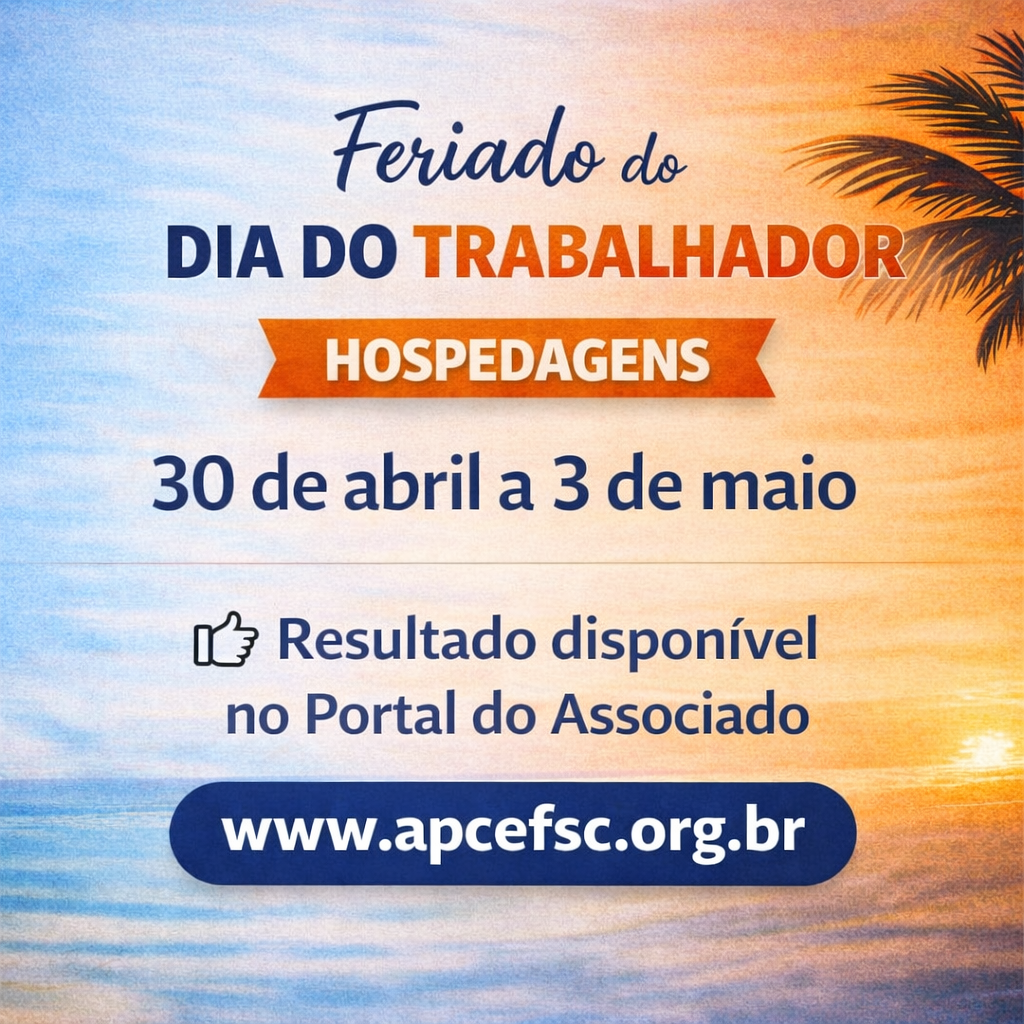 Resultado – Feriado do Dia do Trabalhador 2026 O resultado das hospedagens para o período de 30/04 a 03/05/2026 já está disponível. A consulta deve ser realizada pelo Portal do Associado. O período para cancelamento sem custos será de 10 a 13/04/2026, mediante solicitação pelo