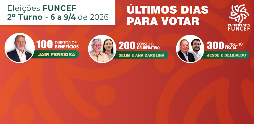 Os participantes da Funcef têm até esta quinta-feira (9) para escolher os representantes que atuarão na manutenção e ampliação das conquistas alcançadas pelo Fundo nos últimos anos. Comprometida com a seriedade que o momento exige, a Federação Nacional das Associações do Pessoal da Caixa (Fenae) apoia, neste segundo turno das Eleições Funcef 2026, os seguintes candidatos que cumprem todos os requisitos necessário para o sucesso do Fundo: Jair Pedro Ferreira, para a Diretoria de Benefícios; Selim Oliveira (titular) e Ana Carolina Melo (suplente) para o Conselho Deliberativo, além de Jesse Krieger (titular) e João Delibaldo (suplente) para o Conselho Fiscal.