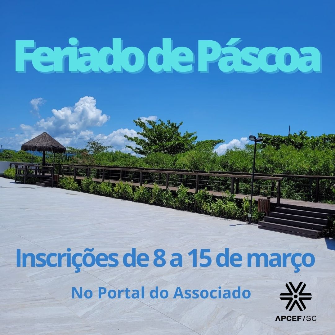 No dia 8 de março inicia o período de inscrições para o feriado de Páscoa. Para hospedagem em: 14 a 17/04/2022. Para se inscrever no processo seletivo, acesse o Portal do Associado com seu login e senha. Confira o cronograma: Início das inscrições: 08/03/2022 Término