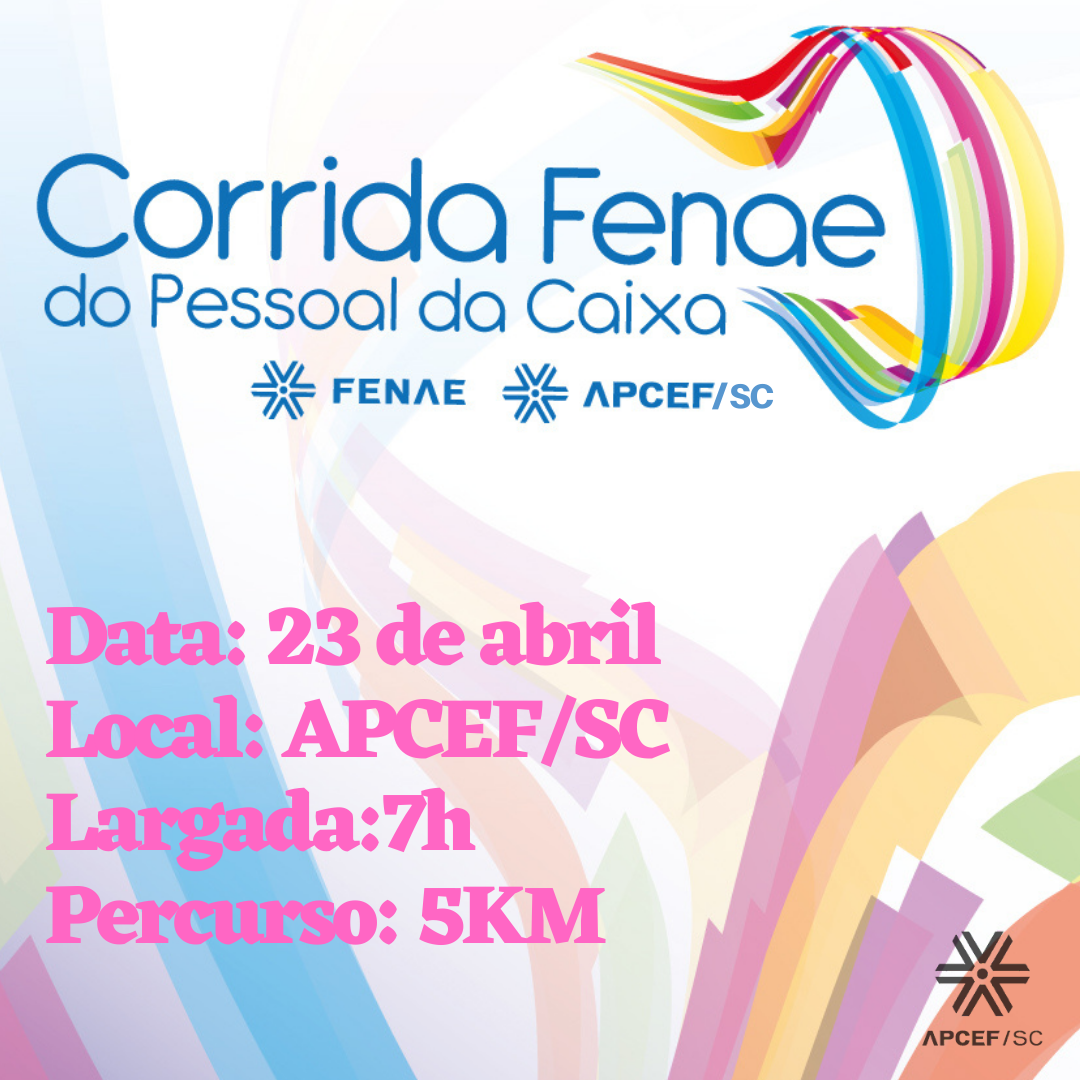 Estão abertas as inscrições para a Corrida Fenae. O evento será no dia 23 de abril, com largada às 7h, na APCEF/SC. O percurso de 5km será entre a APCEF/SC e o Clube 12, em Jurerê. Para se inscrever acesse a ficha. Confira o Regulamento Corrida