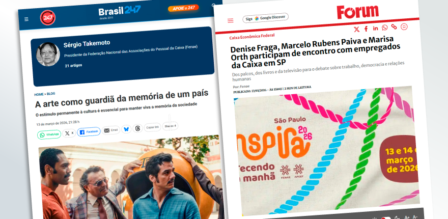 Na última sexta-feira (13), a política da Federação Nacional das Associações do Pessoal da Caixa Econômica Federal (Fenae) de incentivo à arte e à cultura em suas diversas iniciativas repercutiu na mídia nacional. O portal Brasil 247 e a Revista Fórum deram destaque para duas ações que se conectam pelo fio condutor das manifestações culturais: o artigo “A arte como guardiã da memória de um país”, do presidente Sergio Takemoto, e a matéria sobre o evento Inspira 2026, em São Paulo/SP neste último fim de semana (13 e 14/3), voltado aos empregados do banco público de todo o Brasil.