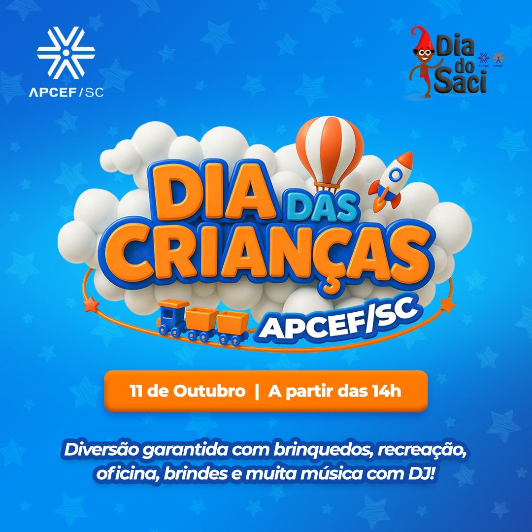 O dia mais divertido do ano para a garotada está chegando! No dia 11 de outubro de 2025, a partir das 14h, a APCEF/SC preparou uma tarde incrível em comemoração ao Dia das Crianças, na Sede Balneária de Jurerê, com uma programação repleta de entretenimento: brinquedos infláveis, oficinas criativas, atividades de recreação, música com DJ, show de mágica com Néstor Palhágico Encantador, piscina aberta, brindes especiais e alimentos e bebidas à venda.