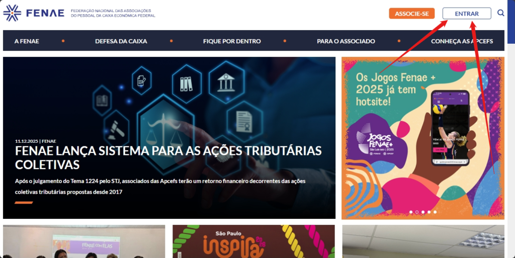 - Na parte superior direita do site, você verá o botão “ENTRAR”. Clique nesse botão para ir para a tela de Login Fenae