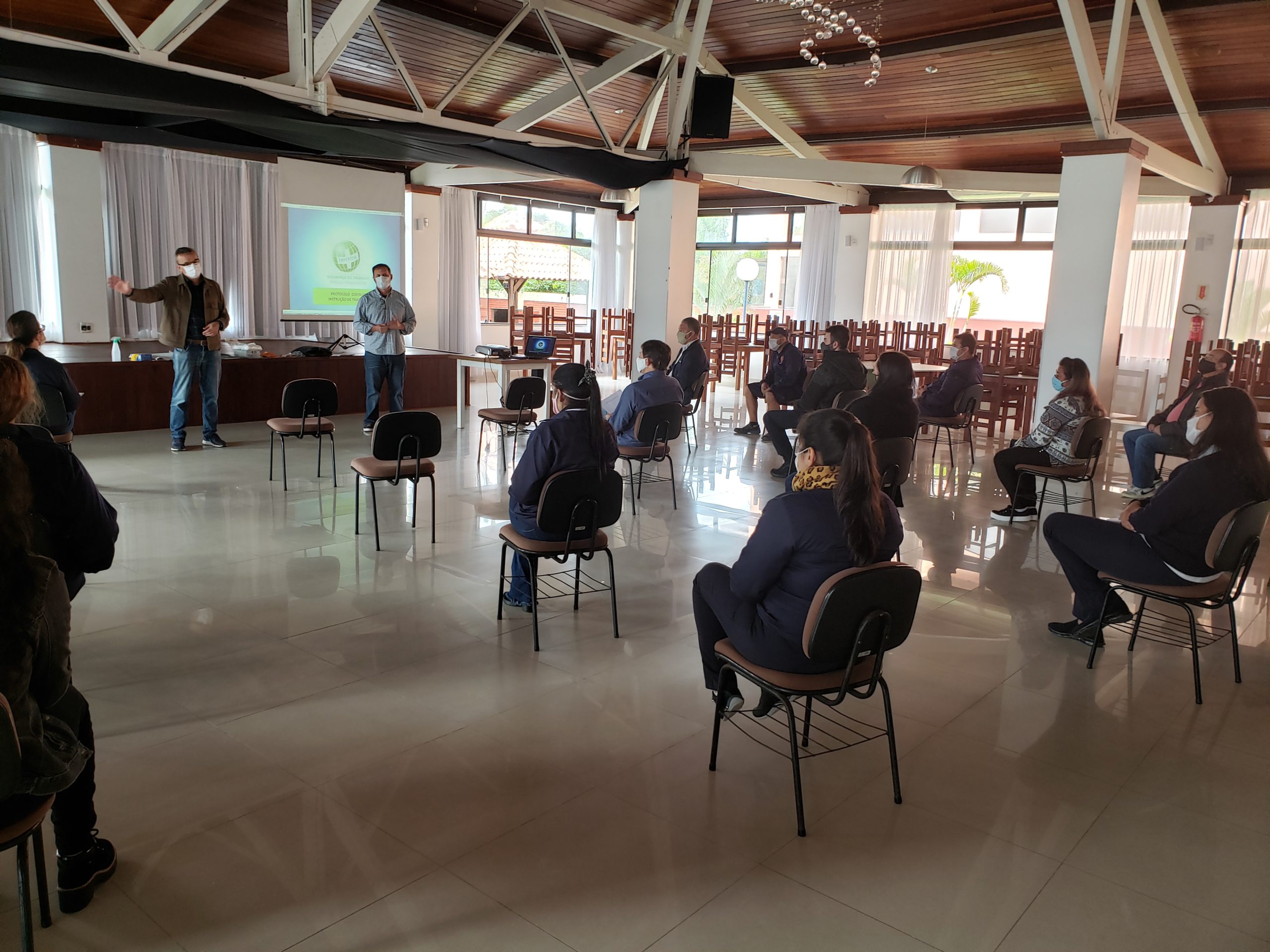 O treinamento foi ministrado por instrutor de Segurança do Trabalho, na tarde de segunda-feira (29), para 16 empregados e repetido na terça-feira (30), para os demais 15 trabalhadores, para evitar aglomeração na sede.