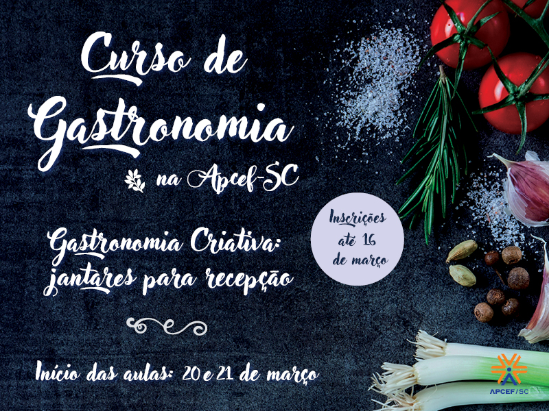 02Está chegando a hora tão esperada pelos chef’s da Apcef/SC. Estão abertas, até o dia 16 de março as inscrições para o Curso de Gastronomia 2018/1 da associação. Nesse primeiro semestre vamos explorar a Gastronomia Criativa e trabalhar os Jantares para recepção e serviço à italiana.
